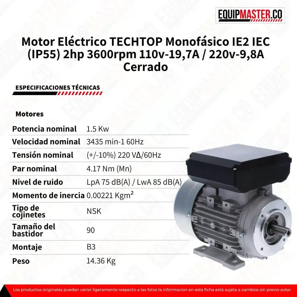 TECHTOP ML90S23 Monofásico IE2 IEC (IP55) 2hp 3600rpm 110v-19,7A / 220v-9,8A Cerrado